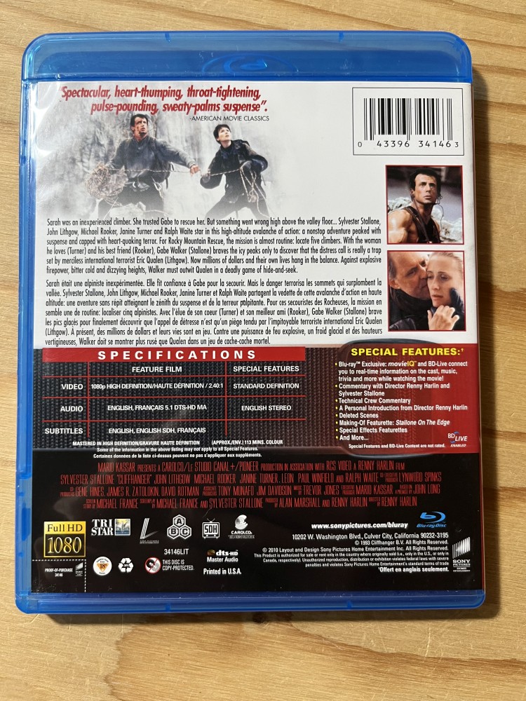 A 1993 action thriller directed by Renny Harlin, starring Sylvester Stallone, John Lithgow, and Michael Rooker. A botched mid-air heist results in suitcases full of cash being scattered in the Rocky Mountains. A former mountain rescuer is unwillingly embroiled in a battle against ruthless criminals.