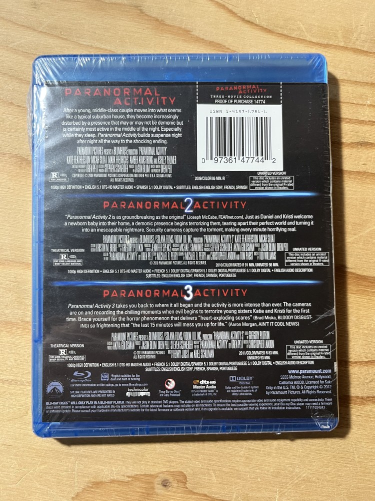 This collection includes the first three found-footage horror films. ‘Paranormal Activity’ (2007) follows a couple haunted by a supernatural presence. ‘Paranormal Activity 2’ (2010) serves as a prequel, exploring the origins of the haunting. ‘Paranormal Activity 3′ (2011) goes further back in time to the main characters’ childhood.